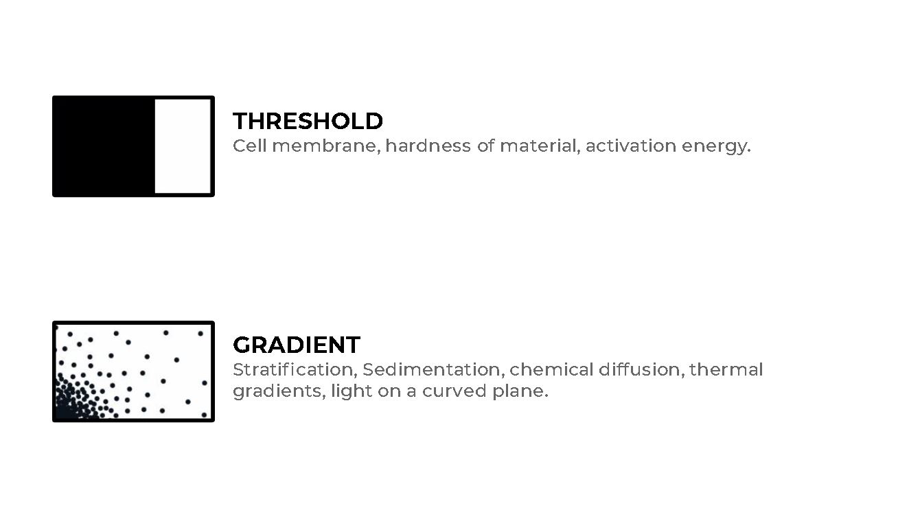 Some of the symbols’ interpretation are less specific which allows them to describe different phenomena. They can be understood in context (e.g. cross-locality can represent heat transfer in thermodynamics, specie migration in ecological terms, or contamination in bio-making).Visual Symbols