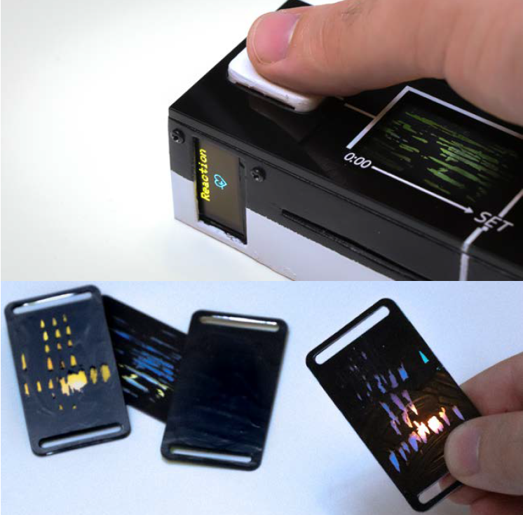 Heart rate sensor, screen with Arduino. No processing beyond that to calculate HRV. Prototyped mechanical way of inscribing, but photo-chemical more miniaturizable (not prototyped).
